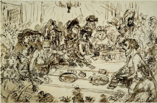 High stakes wagering went on at the tables, too. In Days of the Dandies Captain Gronow tells the story of General Scott, father-in-law of George Canning and the Duke of Portland, who won £200,000 in one night at whist. George Harley Drummond, of the famous banking-house, Charing Cross, lost £20,000 at whist to Beau Brummell. As a result, Mr. Drummond was forced to retire from the banking-house of which he was a partner.