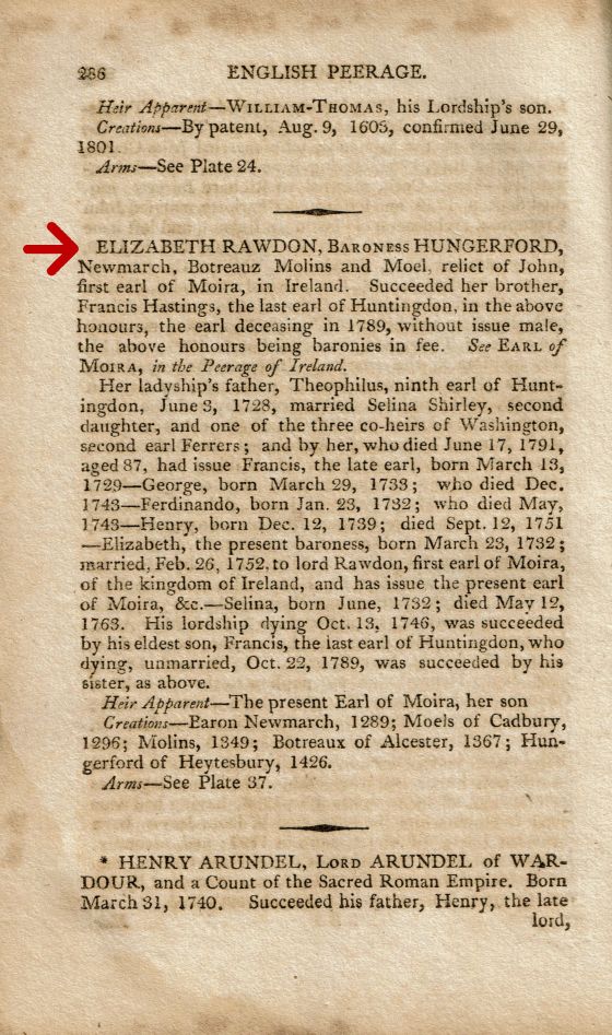 Also, thanks for catching my error in the post. The page image listing Elizabeth Rawdon, Baroness Hungerford specifically states she succeeded her brother in the barony. Not sure how my fingers typed baronetcy instead, but I’ve corrected it now. Thank you for catching it and sharing your comments!