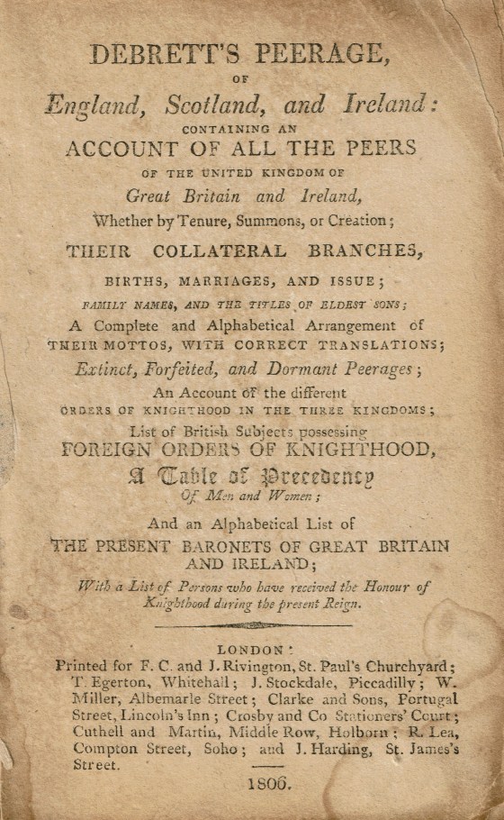 In a used book store in southern California I found a battered 1806 edition of Debrett’s Peerage of England, Scotland and Ireland. Here’s the title page: