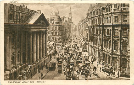 A 1911 postcard showing bustling Cheapside; Mansion House is the structure with columns on the left