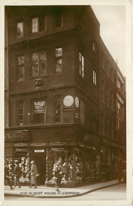 A 1930 photograph of the oldest house in Cheapside. Legend has it this building on the corner of Cheapside and Friday Street survived the Great Fire of 1666.