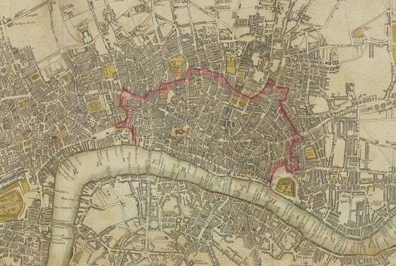 A map of the City of London in 1799, bounded in red, bordering the River Thames.