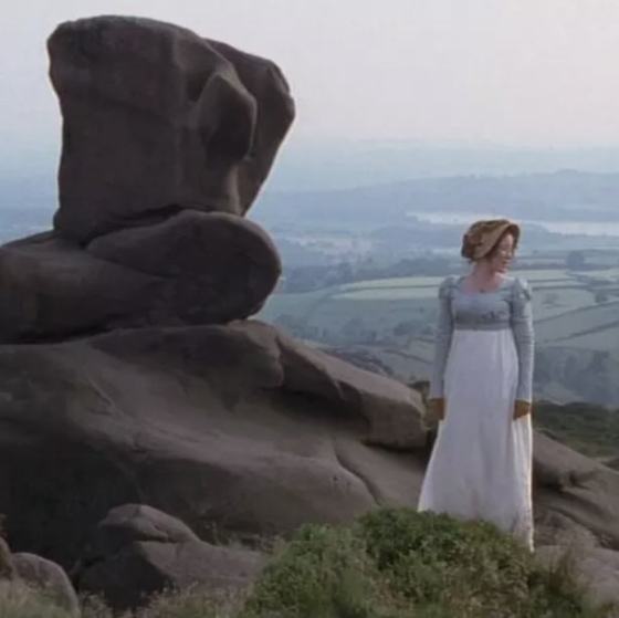 Jennifer Ehle as Elizabeth Bennet in the BBC miniseries looks over the countryside of the Peak District in Derbyshire.