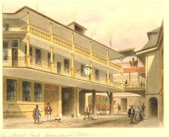 The interior yard of the Spread Eagle Inn on Gracechurch street, about 1850.