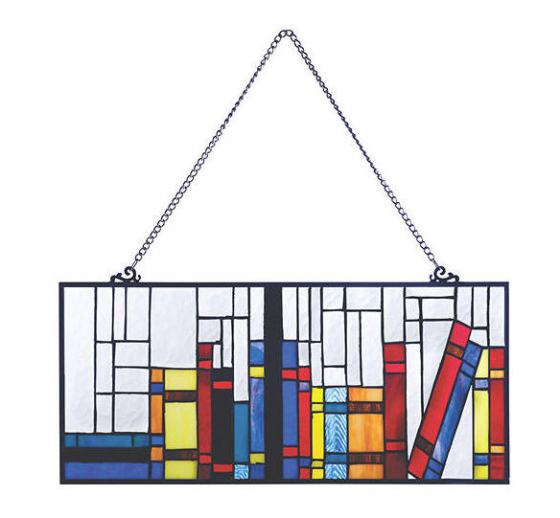 Stained glass hanging of books on a shelf. Wouldn’t this be a lovely addition to a favorite sunny window?