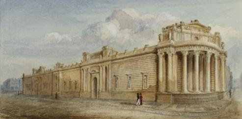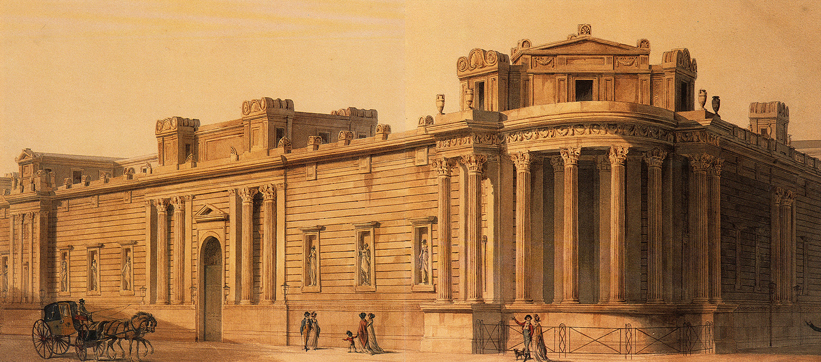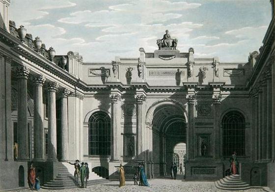 The rear facade of the Bank of England, known as Tivoli Corner. In 1807 the wall niches contained figurative statues.