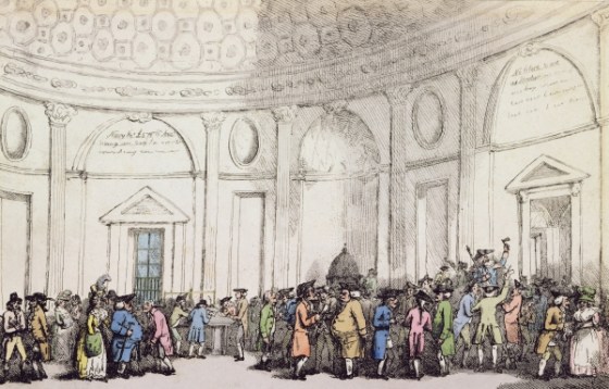 The Bank of England rotunda, when it was used as a stock exchange; from a 1792 etching by Thomas Rowlandson.