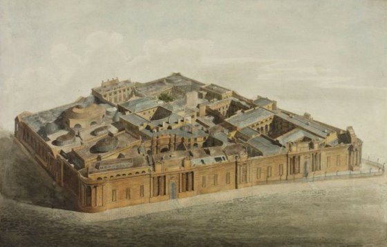 I think Mr. Sloan accomplished his purpose. Here’s a bird’s-eye-view drawing of the Bank of England after it underwent an expansion in 1810, under Mr. Sloan’s direction. After the expansion, the Bank of England covered over three acres of prime London real estate. In the drawing you can see the various courts and interior buildings contained within the Bank’s impressive outer walls.