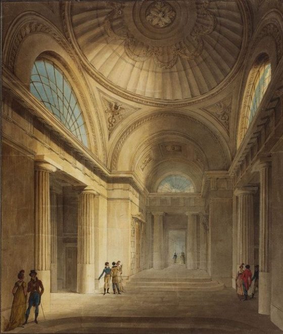 Whenever I decide to visit my money in person, I go to my local branch, where the first thing I see on entering is wide open area, containing neat rows of desks and a line of teller windows. By contrast, here’s the Bank of England’s Doric Vestibule, as it appeared in 1803.