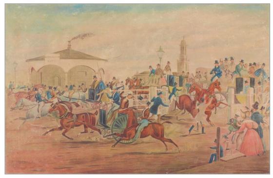 Another question I hoped to answer through these art pieces: Did ladies attend race meets? In the first image above there is a woman in the foreground of the picture, but I think she’s merely watching the men, on horseback and in carriages, as they pass through the gate on their way to the meet.