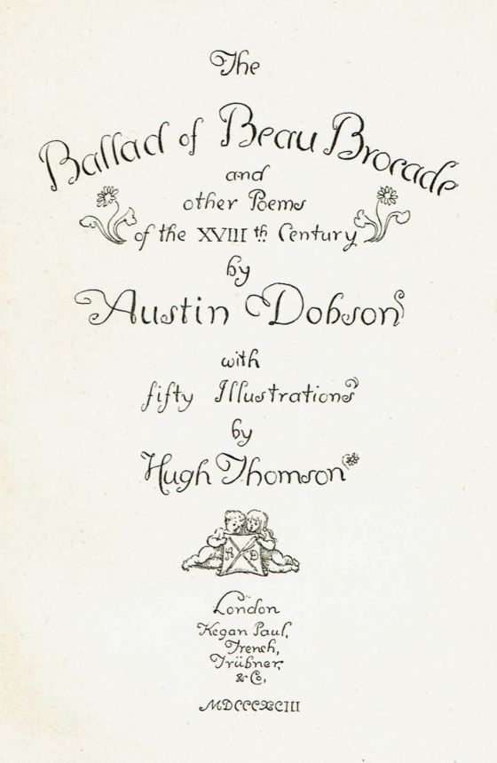 Beau Brocade was published in 1893. It’s a light-hearted collection of poems about imaginary characters of the Georgian era. Here’s the title page, designed by Hugh Thomson: