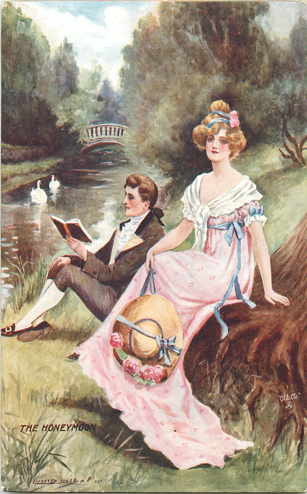 The title of this piece is “The Honeymoon.” I rather like the romantic setting, as the newlyweds relax together on a grassy slope beside a gentle brook, while a pair of swans glide by. Do you suppose the gentleman is reading poetry to the lady?