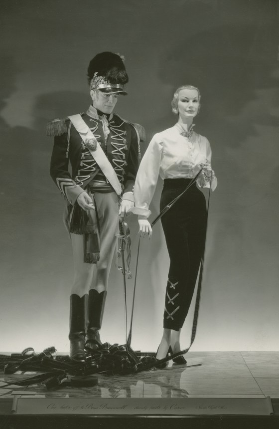 Here’s another of the Bonwit Teller window displays from 1954. In this display the female mannequin is again wearing high-waist pants with a seam detail that mimics the brocade on the male mannequin’s military jacket.