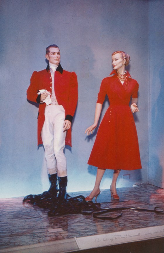 There’s a scene mid-way through the movie when Beau Brummell joins the Prince of Wales on a hunt. Bonwit teller depicted the scene, matching their idea of a modern, 1950s woman in a red dress and heeled shoes with a gentleman’s hunting pink, which consisted of a long red coat, white shirt and pants, and black boots.
