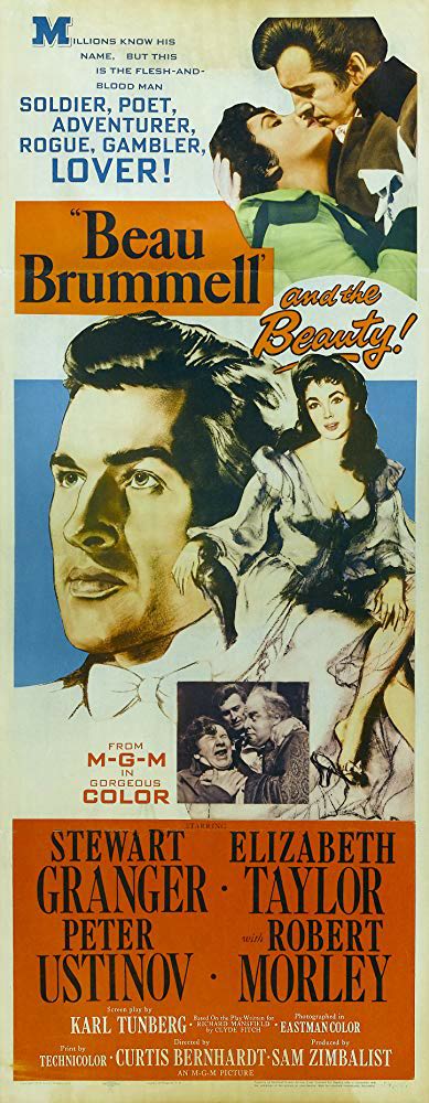 Why were people in the 1950’s so interested in Beau Brummell? Because in 1954 MGM released a movie that was supposed to be about Beau Brummell’s life. The film starred Stewart Granger as The Beau, Peter Ustinov as the Prince of Wales, and Rosemary Harris (mother of Jennifer Ehle, my favorite Lizzy Bennet) as Mrs. Fitzherbert.