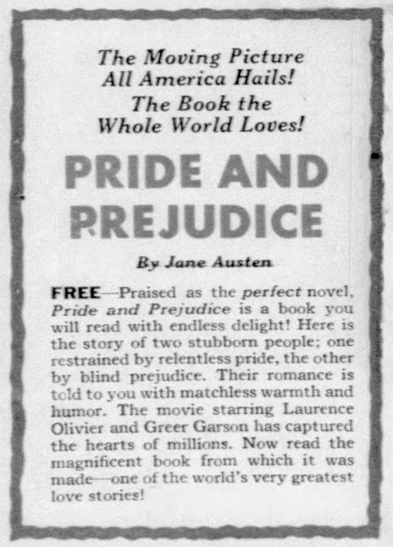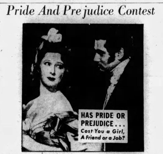 One newspaper encouraged readers to submit stories (in 100 words or less) about how “pride or prejudice cost you a girl friend, boy friend, a friend or a job.” The prize: a copy of Pride and Prejudice autographed by the film’s star, Greer Garson.