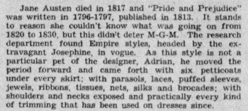 Adrian did his research and was aware of the Grecian-inspired style of clothing in vogue during the time period in which Pride and Prejudice takes place; but for this film he decided to follow his own taste, instead. An article in the May 19, 1940 issue of The Detroit Free Press explains why: