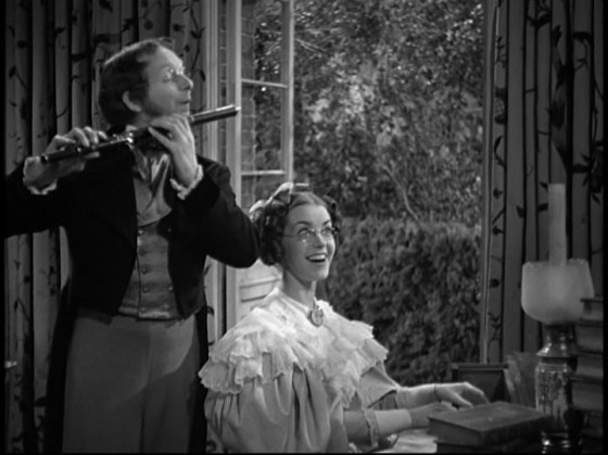 MGM’s commitment to going for the big laughs is what probably led to several scenes that never appeared in the book, like the ridiculously improbable carriage race in the beginning of the movie. It also led to scenes like this one, where Mr. Collins and Mary Bennet show off their musical talents (or lack thereof):