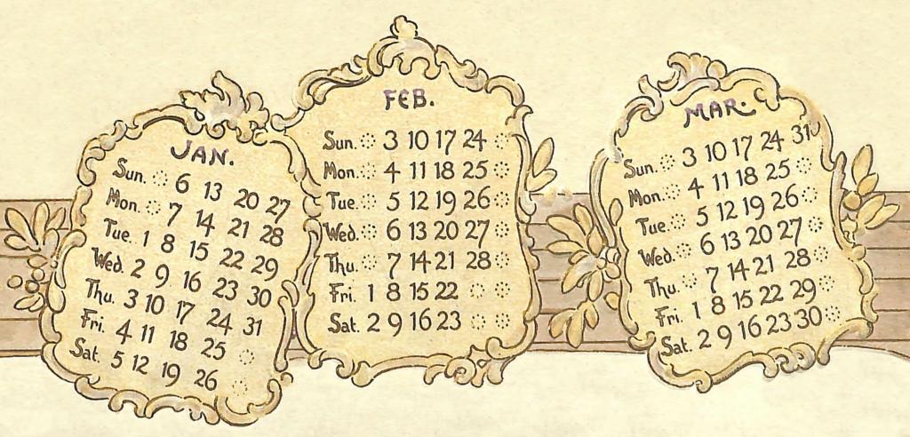 Luck was on my side. I found these images that made up a hanging wall calendar from 1901.