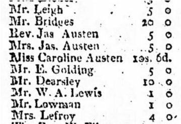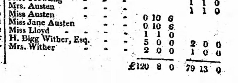 Did you recognize any other names in that excerpt? Jane’s friend, Miss Lloyd, contributed to the fund, as did Harris Bigg-Wither, and perhaps one of Harris’ cousins, a Mrs. Wither.