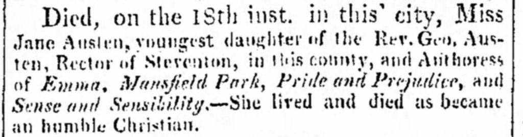 The last clipping I’ll share is this brief, but respectful, notice of Jane Austen’s death, which appeared in the Hampshire Telegraph and Naval Chronicle on Monday, July 28, 1817: